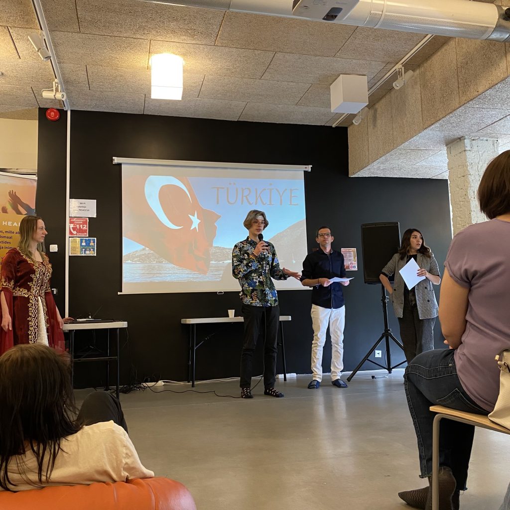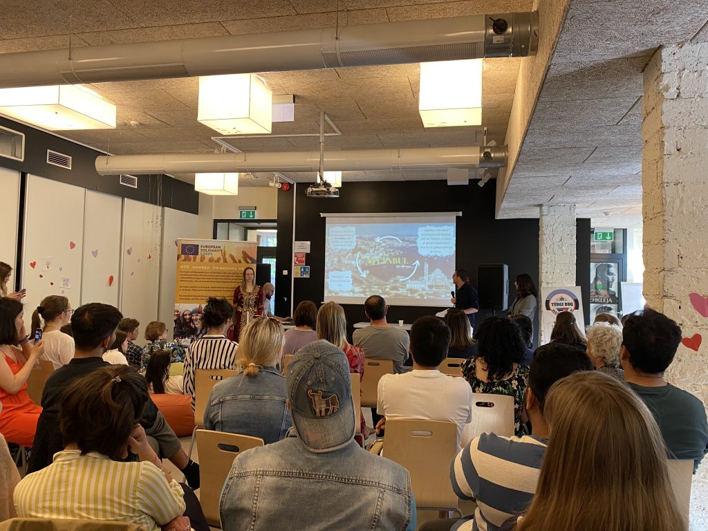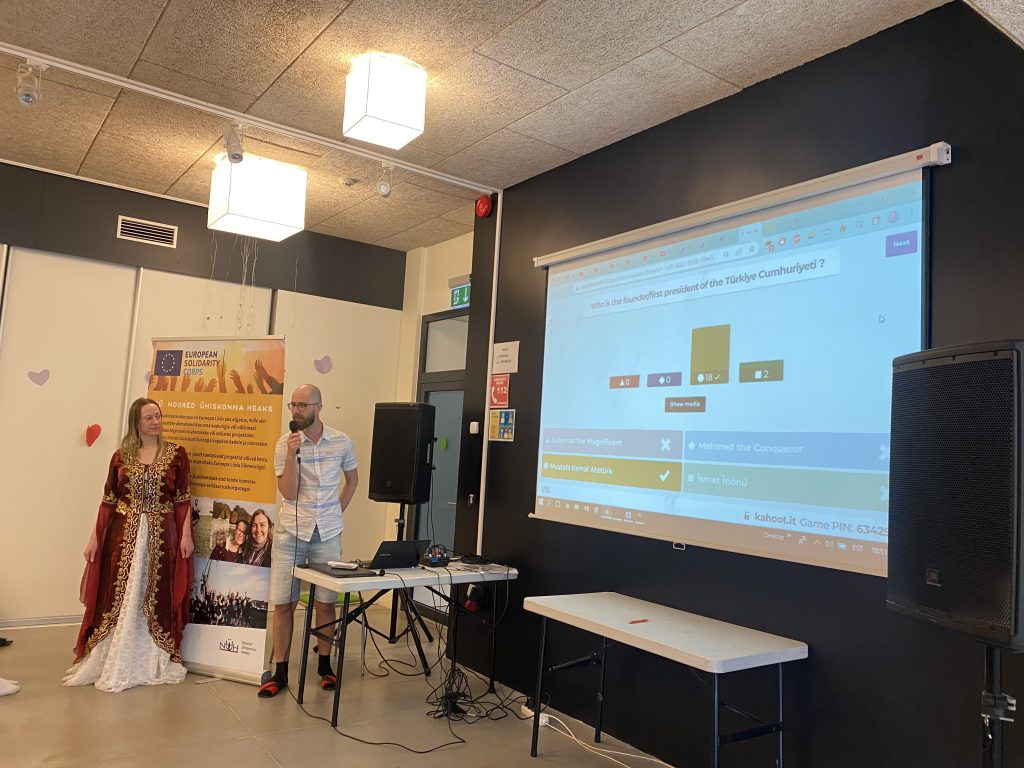 Birkaç gün öncesinden salona gidip masaları ve sandalyeleri ayarladık. Gençlik merkezi çalışanları ile o gün sorumlu kişilerle tanıştık. Programın üzerinden geçtik. Sonunda büyük gün yani 16 Haziran gelmişti. Misafirleri salona alırken ellerine kolonya döktük. Herkes yerine geçtiğinde programın sunucusu ben ve Müşerref herkesi selamlayıp, ilk bölümde organizasyon ekibimiz olan Ezgi’yi, Selman’ı ve Ksenija’yı tanıttık. Ekibin tanıtımı sonrası katılımcılarımızdan İstiklal Marşımızı söylemek üzere ayağa kalkmalarını rica ettik. İstiklal Marşımızı söylememizin ardından, önce ev sahibi olan Kesklinna Noortekeskus’u temsilen bir arkadaşımız gençlik merkezini ve çalışmalarını anlattı. Sonra ev sahibi kurumum olan Noored Ühiskonna Heaks’i temsilen ESC koordinatörümüz Tairi bizi ve yaptığımız çalışmalarımızı anlattı. Tairi’de sunumunu bitirdikten sonra ben ve Müşerref Türkiye ile ilgili sunumumuzu gerçektik. Sunuma başlamadan önce katılımcıları bizleri iyi dinlemelerini tavsiye ettik çünkü bizden hemen sonra Selman Kahoot üzerinden bilgi yarışması düzenleyecekti. İlk 3’e de hediyelerimiz olacaktı. Sunumun ve Kahoot’un ardından, ilk 3 yarışmacıyı alkışlarla sahneye davet edip hediyelerini verdik.