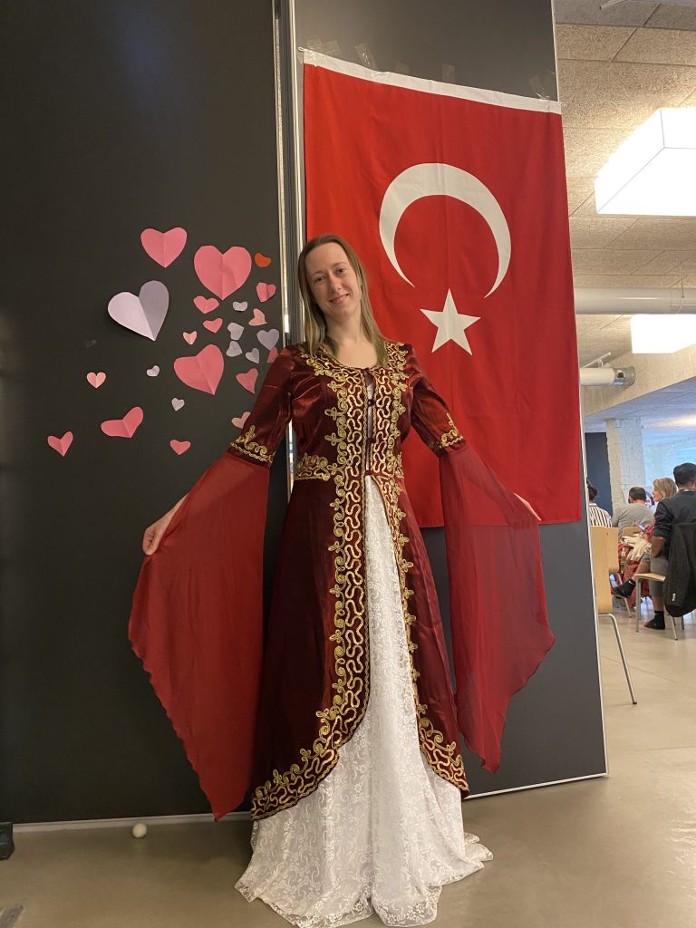 Finally, there are a few issues that I think are important. I want to share them with you too. We did our event entirely in English, but when sending an e-mail to local institutions, etc., we mentioned we could translate it into Estonian if needed. Müşerref’s poem ”I Want My Country” was found very favorable. It was one of the questions in Mozart’s Turkish March on Kahoot that we played during our presentation. Our Estonian friend Sandra was on the stage for about 2 hours wearing a local Turkish outfit. Ezgi’s application of henna to those who requested it was greatly appreciated. The program took 3 hours in total. After it was over, as the organization team, we went to Türqi BBQ and celebrated together.