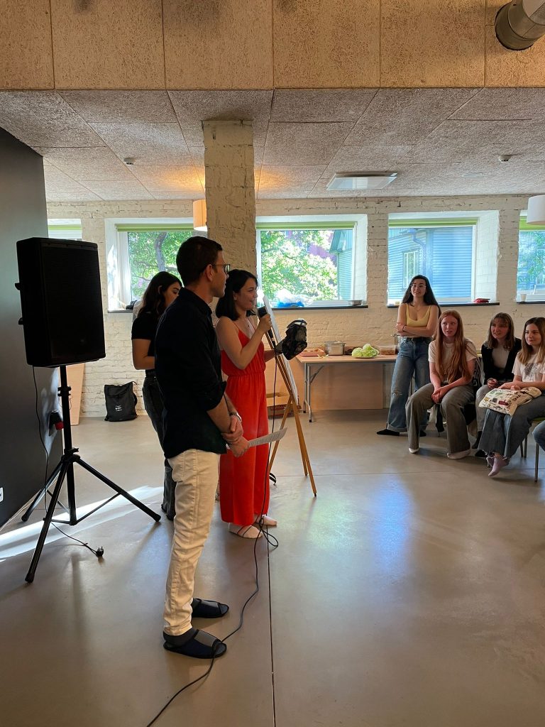 We went to the youth center and set the tables and chairs a few days ago. We met with the youth center staff and the responsible people that day. We went over the program. Finally, the big day, 16th June, had arrived. We poured cologne on the hands of the guests while we were taking them to the hall. When everyone was in their place, the program host, Müşerref, and I greeted everyone and introduced our organization team, Ezgi, Selman, and Ksenija, at the beginning. After the introduction of the group, we asked our participants to stand up to sing our National Anthem. After we sang our National Anthem, a staff representing the host, Kesklinna Noortekeskus, told us about the youth center and its activities. Then, representing my host organization, Noored Ühiskonna Heaks, our ESC coordinator Tairi talked about us and our work. After finishing her presentation of Tairi, Müşerref and I did our presentation about Turkey. Before starting the presentation, we advised the participants to listen to us carefully because Selman would organize a quiz on Kahoot right after us. We would have gifts for the top three people. After the presentation and Kahoot, we invited the first three contestants to the stage with applause and gave their gifts.