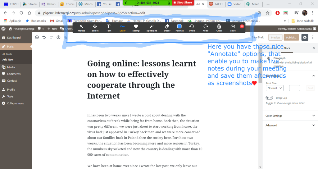 I am striving to find some positive sides of the remote work resulting from the unexpected pandemics. I would say that the discovery of many tools I have not known before or just heard about but never decided to use is one of them. I am even thinking sometimes – maybe the current situation will have such a big impact that it will speed up the digital transition of many workspaces and of education systems in general?