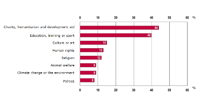The following graph shows the diversity of activities that young people undertook as volunteers, the most popular being related to charity, humanitarian and development aid projects, and activities related to education, training or sports: