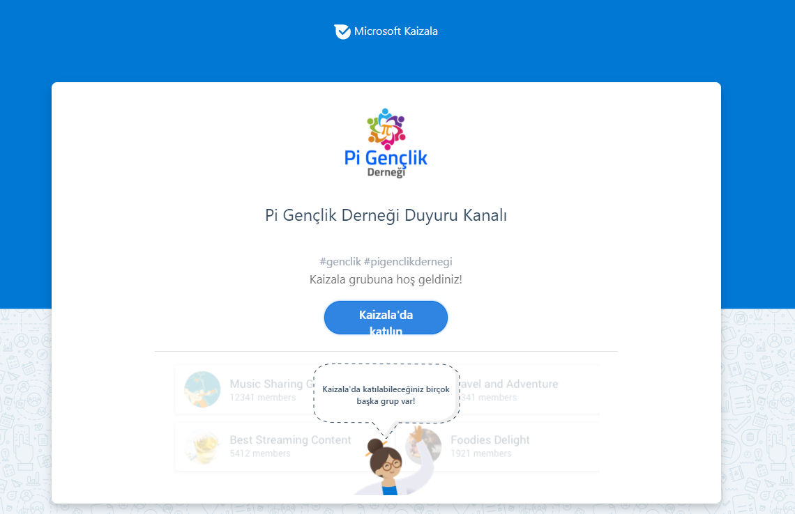 Pi Gençlik Derneği tarafından yayınlanan proje, etkinlik ve faaliyetlerin hepsinden haberdar olmak ve kaçırmadan takip etmek isterseniz, sizleri yeni iletişim kanalımız olan Microsoft Kaizala Grubumuza bekliyoruz. Gruba katılmak için sadece Microsoft Kaizala uygulamasını cep telefonunuza indirmeniz ve bağlantısını ziyaret etmeniz yeterli.